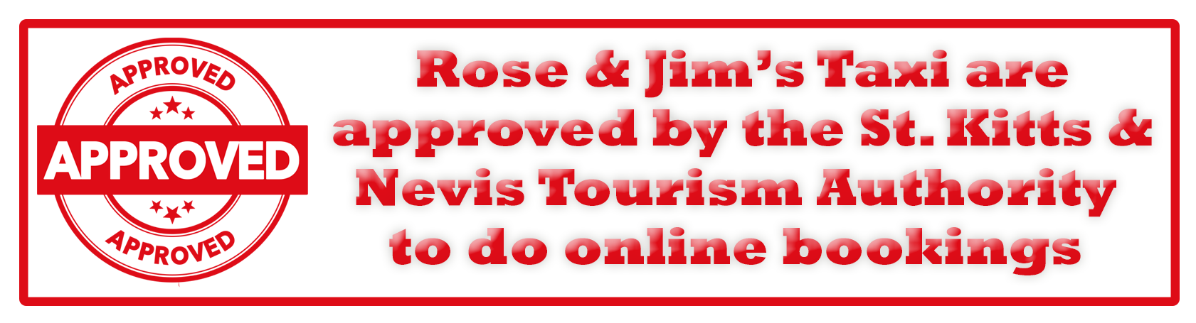 Rose & Jim’s Taxi are fully Covid-19 aware, and the health & safety of our guests is of upmost importance. That’s why we take the following procedures to minimise any risks associated with Covid-19 to help keep your guided tour with us as safe as possible: • Both Rose & Jim have had all their Covid-19 vaccines including the booster jab. • Our mini buses have been enhanced to provide added protection by the inclusion of an isolation screen to separate our touring guest space from the driver’s cab. • Our mini buses are regularly disinfected, and we provide sanitation wipes and gels for your convenience and safety. • We are fully approved* by the St. Kitts & Nevis Tourism Authority to accept online bookings to transport guests whilst the Covid-19 pandemic continues.